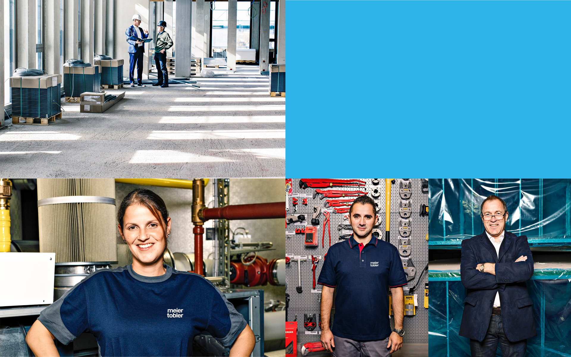Der neue Auftritt von Meier Tobler ist geprägt durch seine einfache und klare Formensprache. Im Kontrast dazu steht die Bildwelt, die zum einen durch ästhetische Sujets architektonischer Leuchtturmprojekte und zum anderen mit ausdrucksstarken Porträts von Mitarbeitenden den Claim «Einfach Haustechnik» treffend zum Ausdruck bringt.